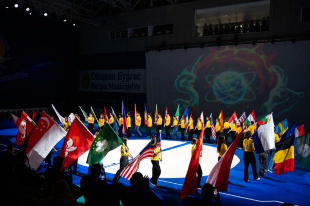 出旗仪式中,各代表队的旗帜从舞台四周向中央汇聚,象征着四面八方的太极拳健儿齐聚布尔加斯。38个国家和地区的太极运动员将在这里以武载道,以拳会友,共襄这场太极盛会。