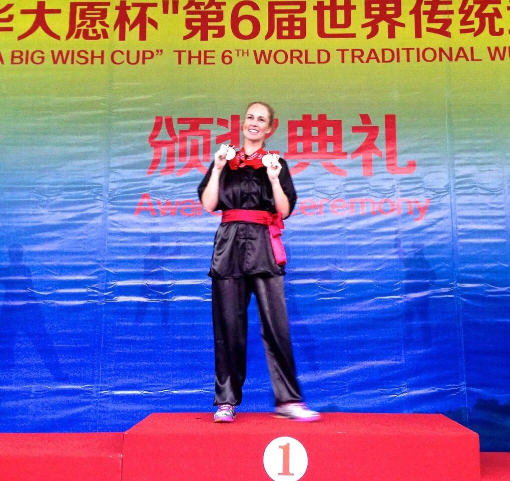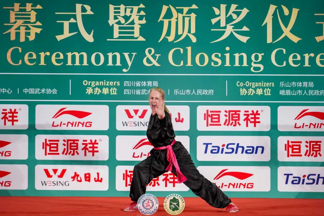 2014年,罗丝玛丽在竞技领域的突出表现引领她踏上了首次世界传统武术锦标赛的征程。这更像是一场漫长的探索之旅——从2014年至2025年间,她先后五次登上世传赛的舞台。“2014年在池州的世传赛经历令我永生难忘,”她回忆道,“那是一场在温暖暮色中进行的户外比赛,夕阳隐没于山峦之后,巨大的佛像矗立在背景之中,世界各国和地区的旗帜在微风中轻轻飘扬,那场首赛的回忆始终萦绕在我心间。第一次走进如此宏大的国际赛事现场,仿佛置身梦境,周围是来自全球各地的运动员。那感受令人敬畏、使人振奋,更给予我深刻的启迪。最终我获得了一个二等奖与一个三等奖,甚至能够站上领奖台而欣喜若狂。”