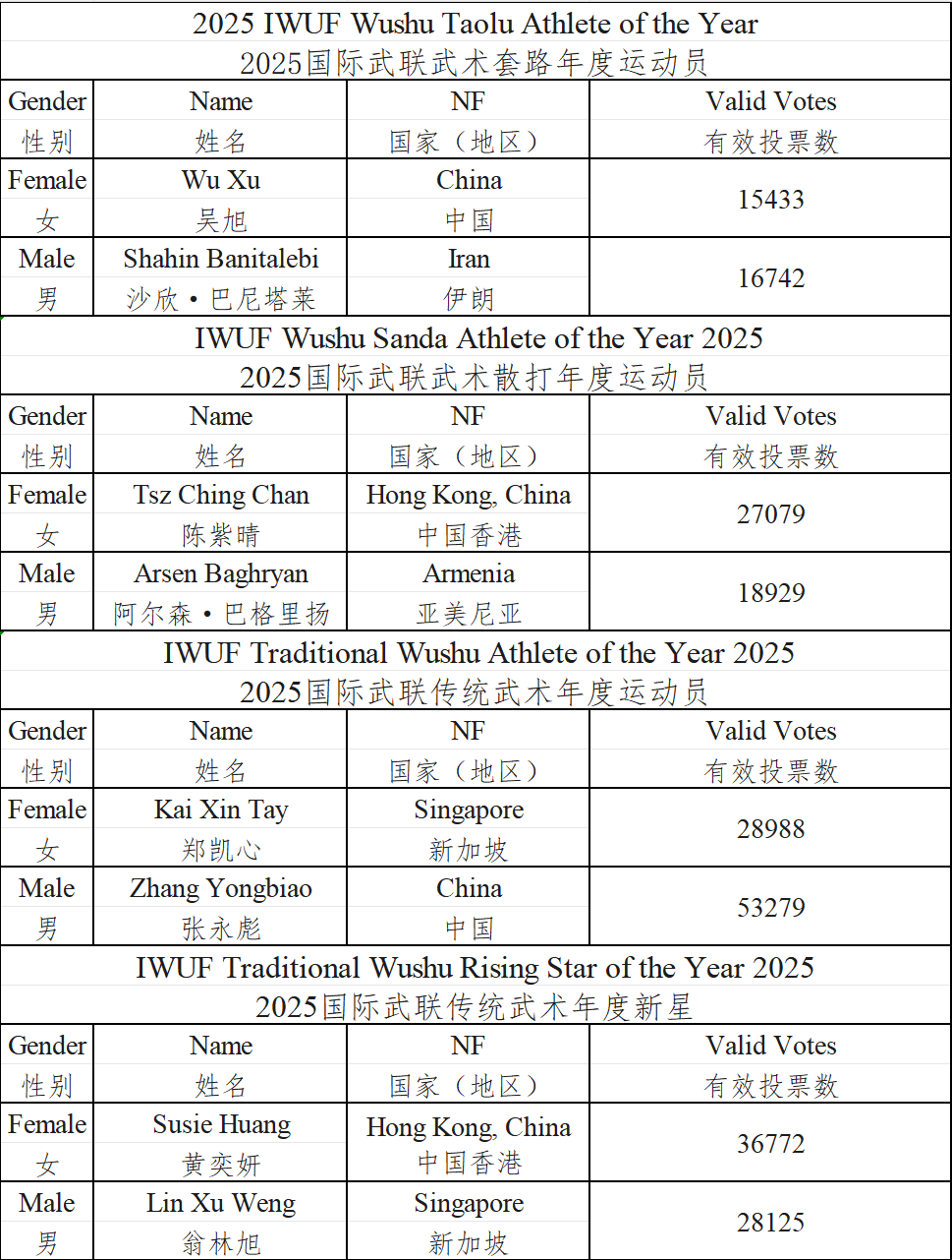 为表彰奖励优秀武术运动员,发挥榜样作用,更好地激励广大武术人才为国际武术事业贡献力量,国际武联自2022年起设立年度运动员奖项。本次评选活动自2025年11月启动以来,受到国际武联会员协会的积极响应和支持。经过运动员委员会评审通过,最终有来自5大洲的23个国家和地区的46位候选人进入国际武联2025年度运动员奖项评选网络投票环节。经过为期一个月的大众投票,最终评选出8位运动员获得国际武联2025年度运动员奖项荣誉称号。现将国际武联2025年度运动员奖项评选投票结果和获奖名单予以公布。