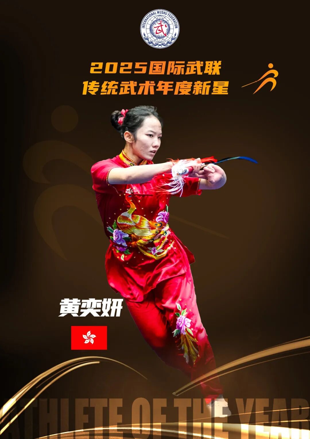 黄奕妍自5岁习武,2017年加入中国香港武术队。在第十届世界传统武术锦标赛上,她一举斩获査拳与剑术两枚金牌。她始终恪守规则、尊重对手,生动诠释奥林匹克精神,以精益求精的态度投入训练,积极传播武术文化。通过参与赛事组织和社区服务,她持续激励青少年投身武术运动。