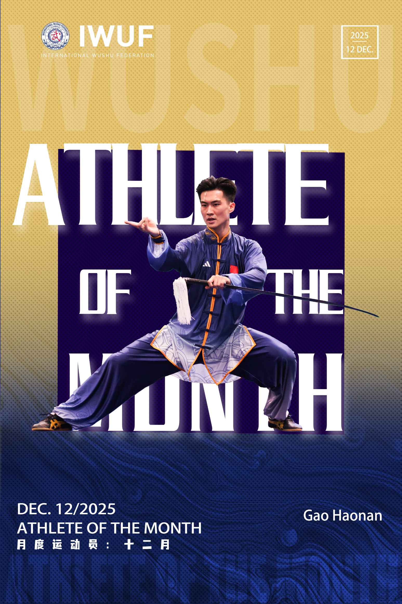 When he was four years old, Gao Haonan chose wushu without hesitation among the hobbies his parents offered, thus launching his wushu career. Before receiving professional training, a seed of the dream to become a champion was planted in his young heart, hoping to stand on the podium one day and hear the national anthem played. Over the course of 21 years of wushu training, he has remained diligent and persistent, with his skills and understanding constantly improving. He was particularly attracted to taijiquan and taijijian. Since he began competing at the age of seven, over the past 18 years, he has won more than 20 gold medals in domestic and international competitions. He has won the men's taijiquan event at the National Wushu Taolu Championships four times. In 2023, he won the gold medal in the taijiquan and taijijian all-around event at the 19th Asian Games. In 2024, he won the taijiquan champion at the 10th Asian Wushu Championships. The year 2025 was especially fruitful for him, as he not only won the taijiquan championship at the Wushu Taolu Asian Cup but also claimed the world championship title in the taijijian event at the 17th World Wushu Championships. For Gao Haonan, wushu has had a profound impact on his life, not only shaping his physique but also refining his character. It has taught him perseverance and humility, always reminding him that no matter how many achievements he has made, he should remain humble, keep learning, and continue to progress.