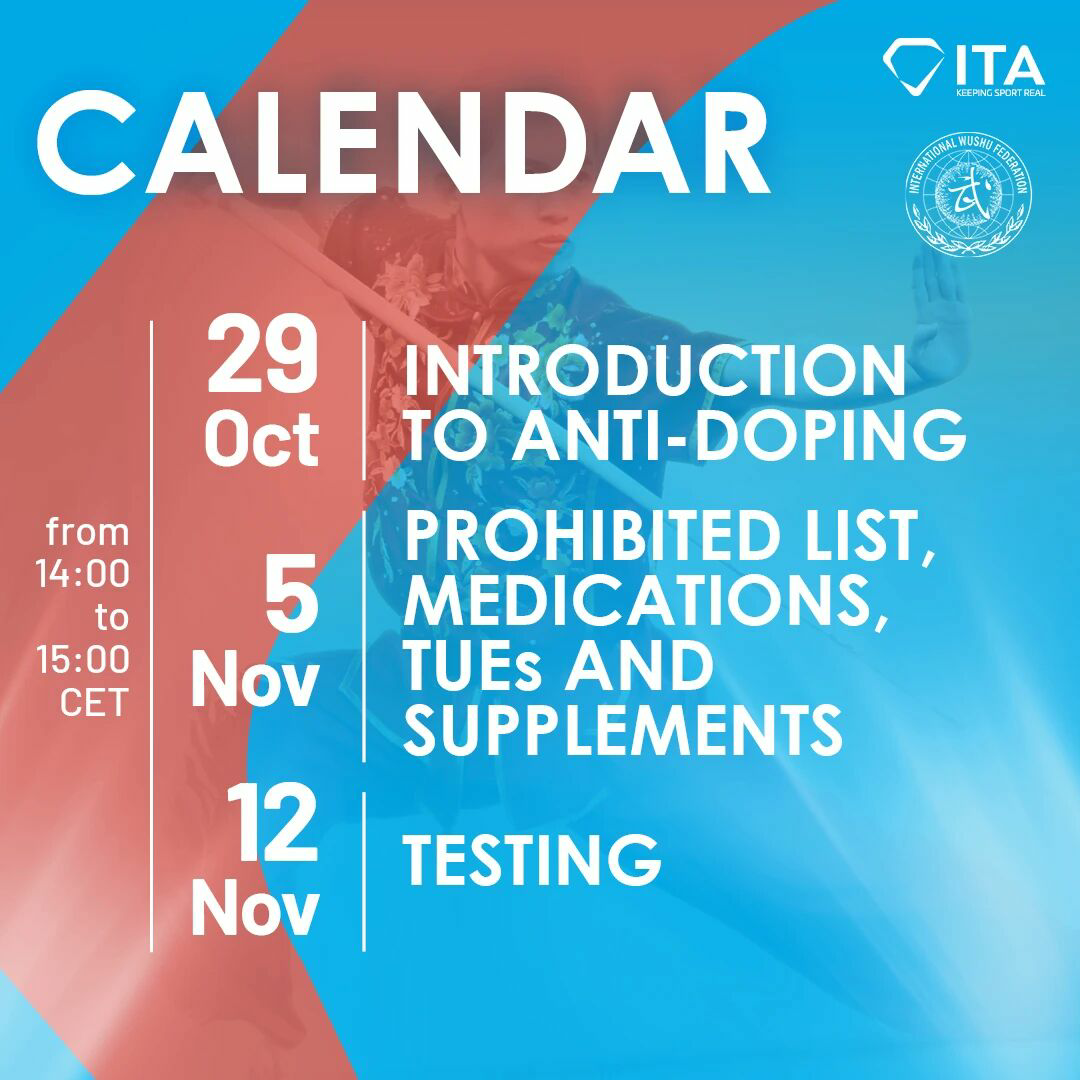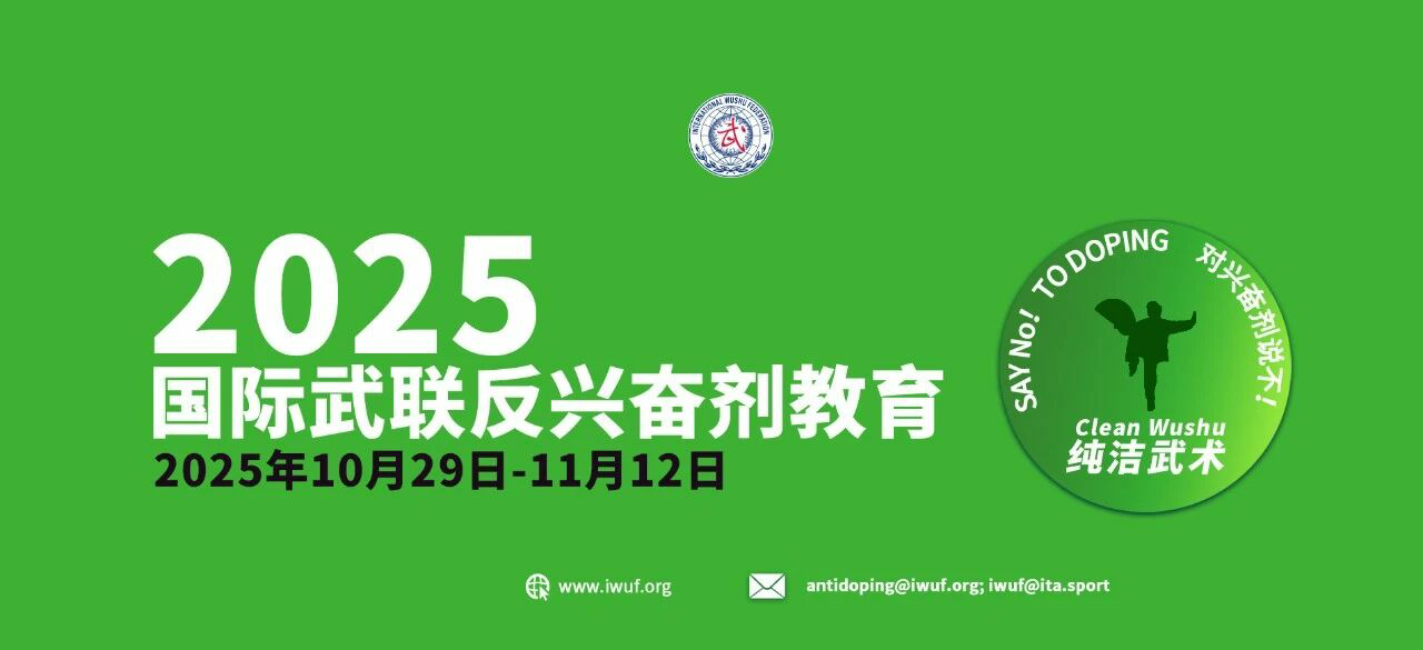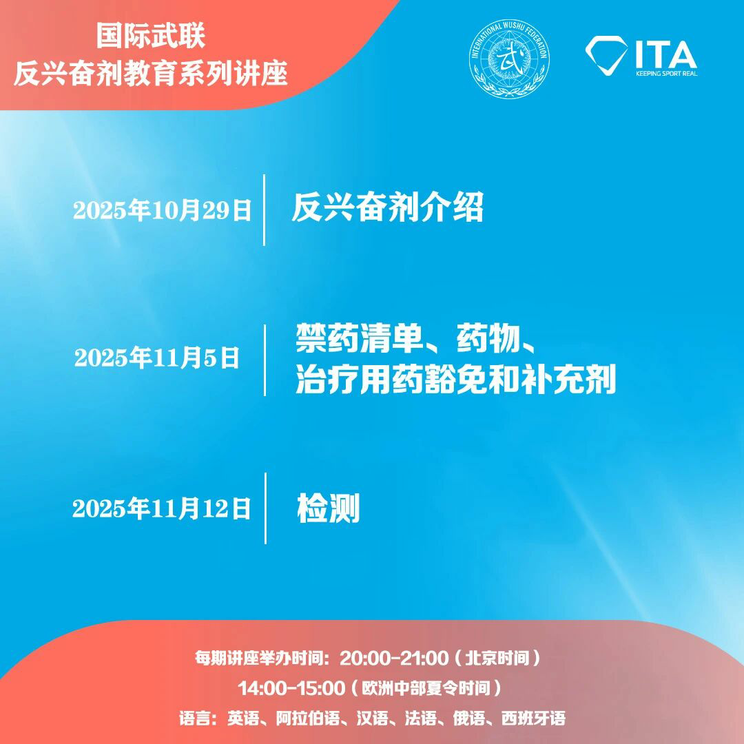 国际武术联合会(IWUF)将携手国际检测机构(ITA)于2025年10月29日至2025年11月12日期间推出反兴奋剂教育系列讲座(共三期),本次线上讲座也是2025年度国际武联反兴奋剂教育计划的一部分。
