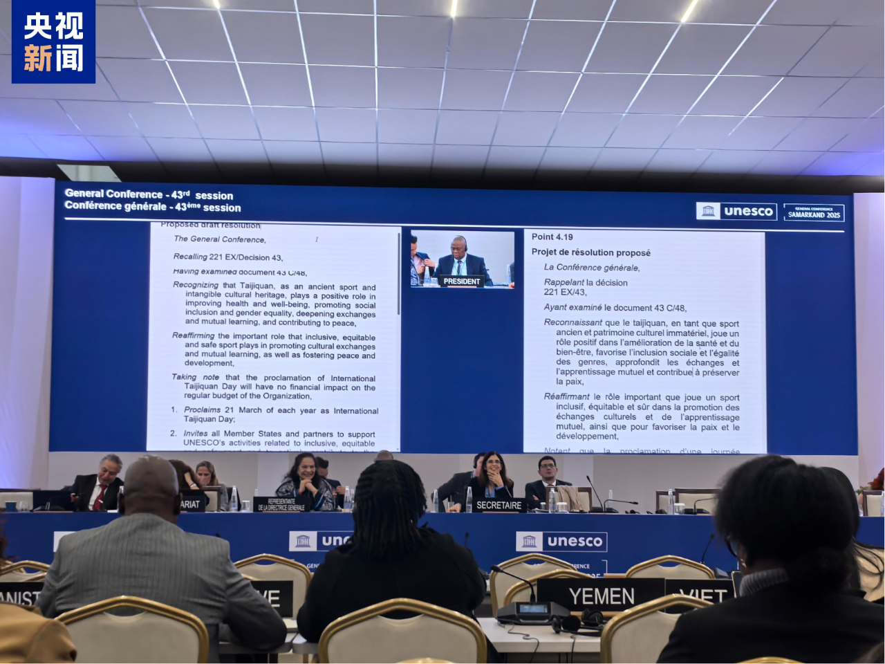 当地时间11月5日,联合国教科文组织大会第 43届会议在乌兹别克斯坦撒马尔罕召开。会议审议通过决议,将每年3月21日(北半球春分日)设立为“国际太极拳日”(International Taijiquan Day)。这是联合国系统首个以武术项目命名的国际日,标志着太极拳的重要价值获得全球广泛认可,是全球文明倡议的生动实践。