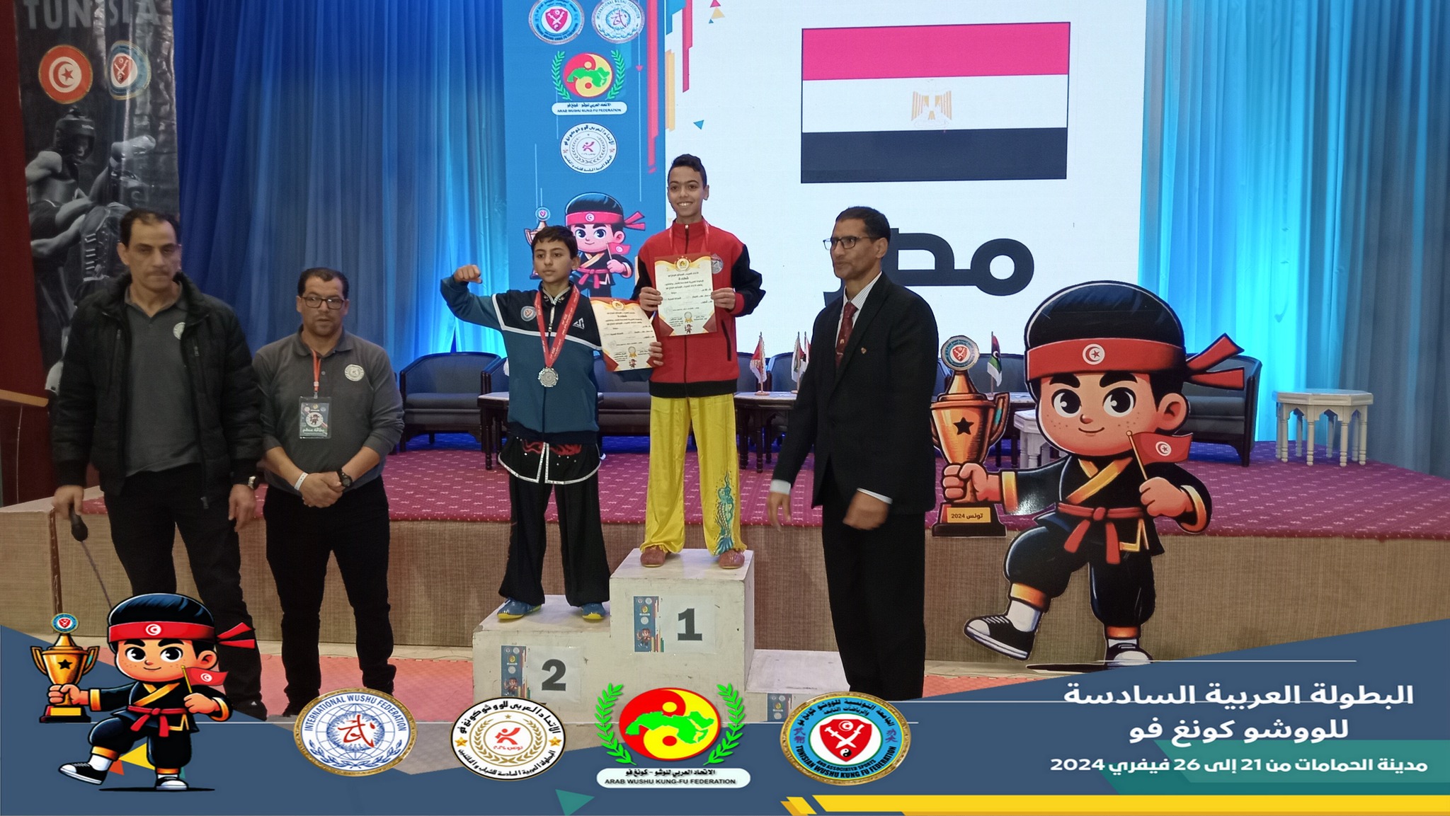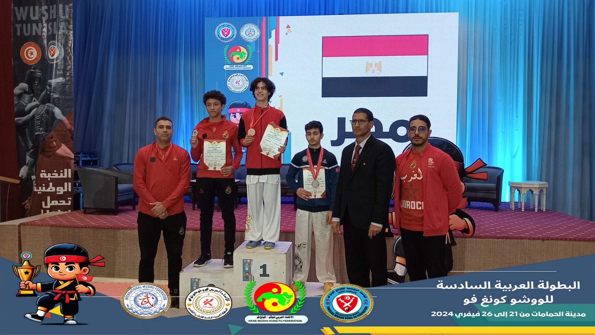 非洲武术联合会主席谢里夫·穆斯塔法先生、副主席穆罕默德·阿德尔·扎赫拉(Mohamed Adel Zahra)先生、突尼斯武术协会主席里亚德-贝尔哈吉(Riadh Belhadj)先生以及来自阿拉伯武术联合会和各参赛国的多位嘉宾出席了锦标赛。